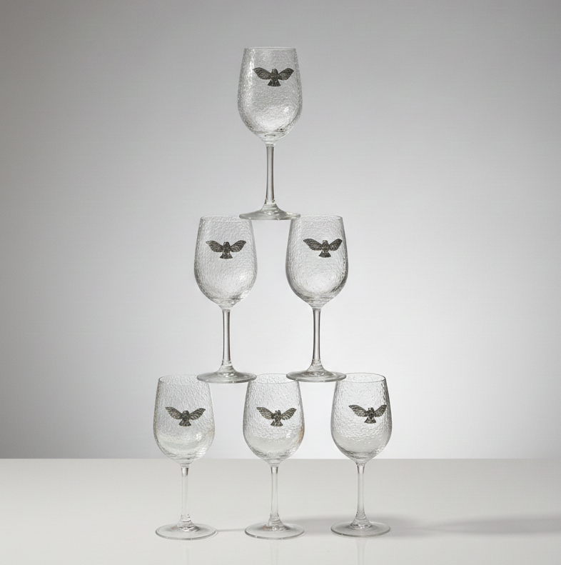 A refined drinkware glass set adorned with a handcrafted 92.5 sterling silver eagle emblem—symbolizing wisdom, strength, and auspicious beginnings. The clarity of the glass paired with the elegance of silver creates a harmonious blend of modern design and traditional meaning. Ideal for serving beverages or as a thoughtful gift for weddings, housewarmings, and festive occasions, this set adds a touch of understated luxury to any setting.