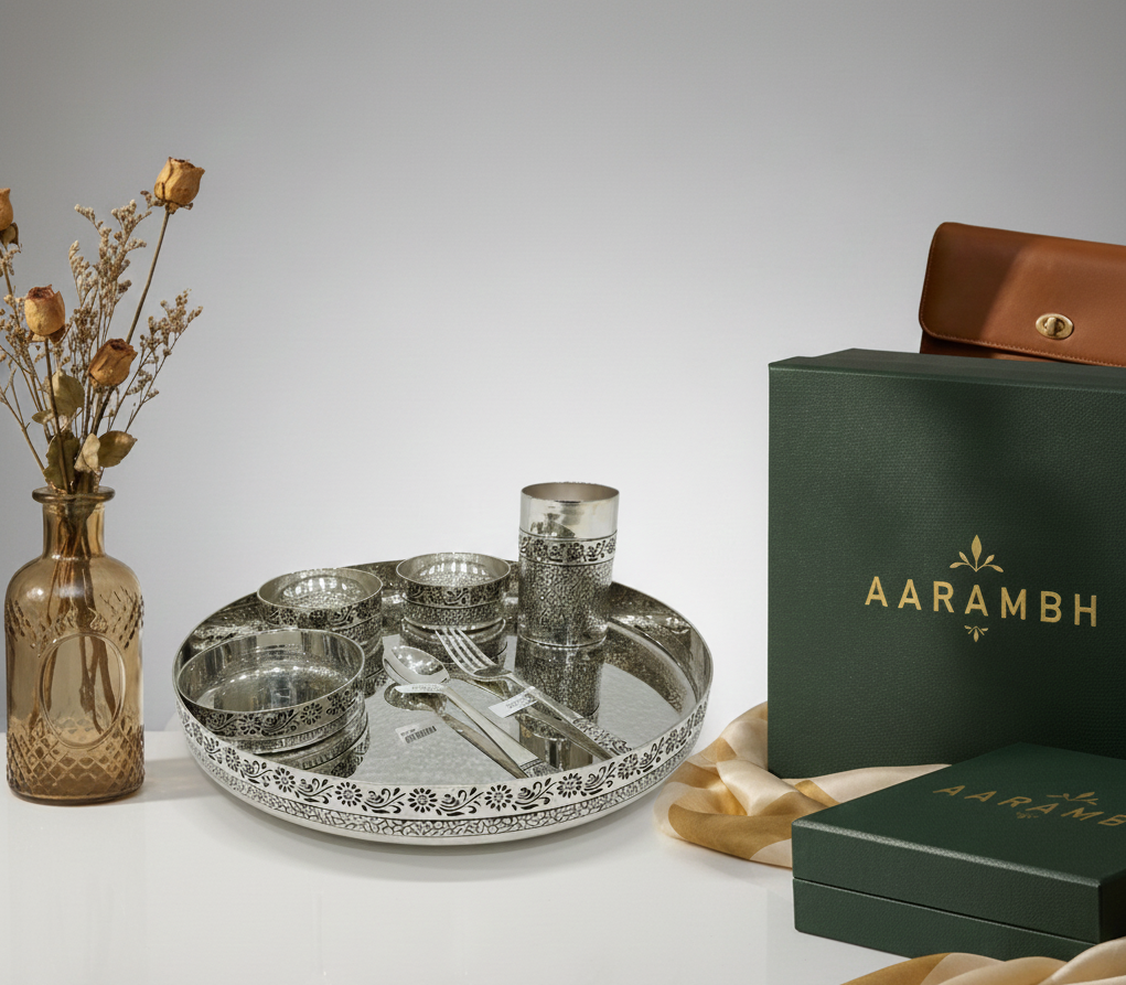 Crafted from premium-quality silver, this elegant glass and tray set features a timeless design, a smooth refined finish, and is perfect for daily use, festive rituals, and thoughtful gifting.
