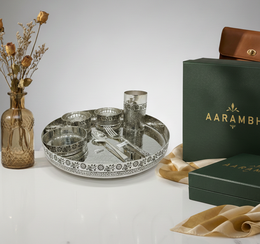 A thoughtfully crafted sterling silver dining plate set featuring a glass, bowl, fork, spoon, and plate—designed for elegant everyday use and special occasions. With its timeless form and refined finish, this complete set is ideal for festive dining, traditional rituals, and meaningful wedding or corporate gifting, reflecting enduring craftsmanship and understated elegance.