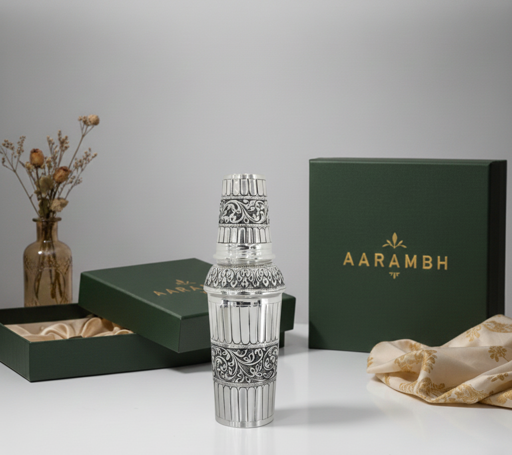 A finely crafted silver bottle made from 92.5 percent pure silver, designed for refined daily use and special occasions. Featuring a timeless silhouette and smooth polished finish, it is ideal for storing and serving water in a traditional and elegant way. A thoughtful choice for rituals, personal wellness, and wedding or corporate gifting.